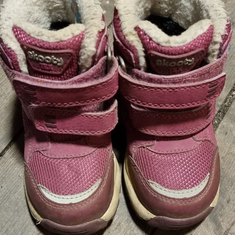 Viking barnevinterstøvler i størrelse 29. Støvlene er rosa og har borrelåslukking for enkel tilpasning. De har en solid såle med godt grep, egnet for vinterbruk. Materialet er slitesterkt og egnet for utendørs aktiviteter. Brukt en sesong, mye sko igjen.