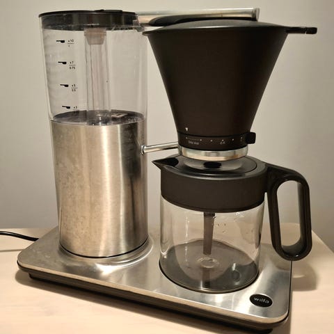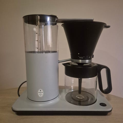 WMF KÜCHENminis kaffetrakter i rustfritt stål og svart plast. Kaffetrakteren har en termokanne i rustfritt stål med svart håndtak. Enheten har vannivåindikator og avtagbar filterholder. Egnet for hjemmebruk og tilberedning av flere kopper kaffe.