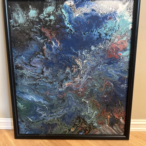 Abstrakt maleri i mørke toner og m/innslag av sølv og glitter selges. «Stormen» malt av kremmeren selv. 🎨👩 Akryl på lerret. Mål 48,5x59,5cm. Kantene er også malt, så det kan henges rett på veggen. Unikt, finnes ikke maken. Signert. Selges som det er. Se bilder.