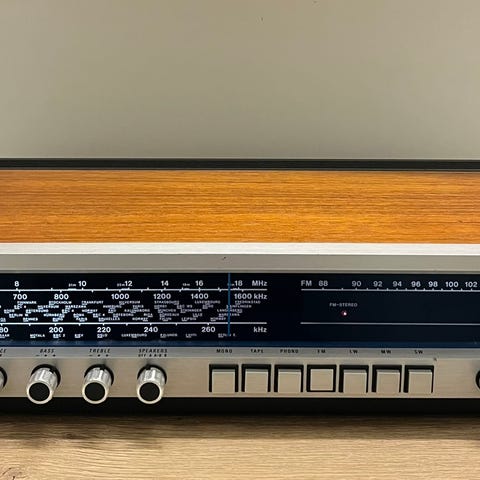Receiveren har vært i bruk frem til nå og fungerer fint. Det er noe knitring i volumknappen, noe som er vanlig på eldre utstyr og som ofte kan løses med en rens. Litt småriper på toppen, men ganske fin lell.