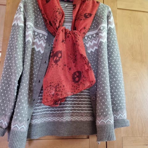 Lang strikkejakke fra Lindex selges kr 300,- str L. Brun grå farge