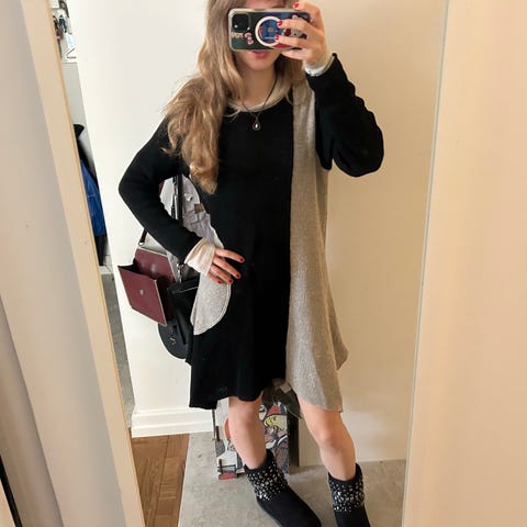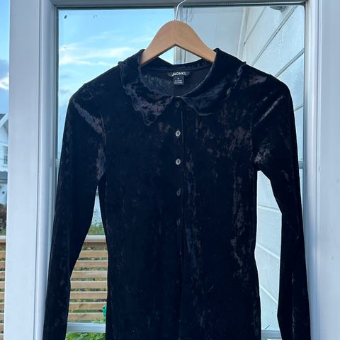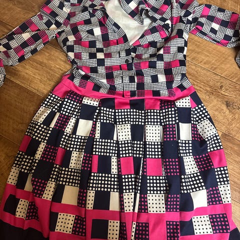 Med god stretch. Passer S-M-L. Nydelig detaljer fram med knytting og flettemønster. Ser ut som cardigan tatt over. Sitter pent pga strikk i livet. Den er ekte vintage fra begynnelsen av 2000-talet