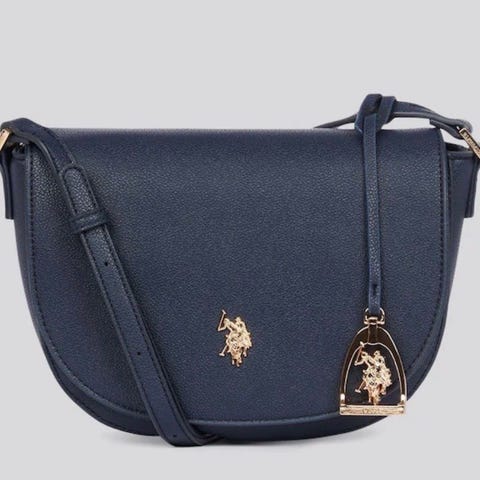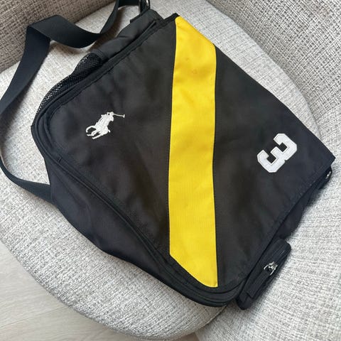 Polo Ralph Lauren Stoff Skulderveske i mørk blå med rødt diagonalt bånd og gule detaljer. Vesken har flere lommer, inkludert en hovedlomme med glidelås og flere mindre rom for organisering. Justerbar skulderrem for tilpasset passform. Egnet for både menn og kvinner.