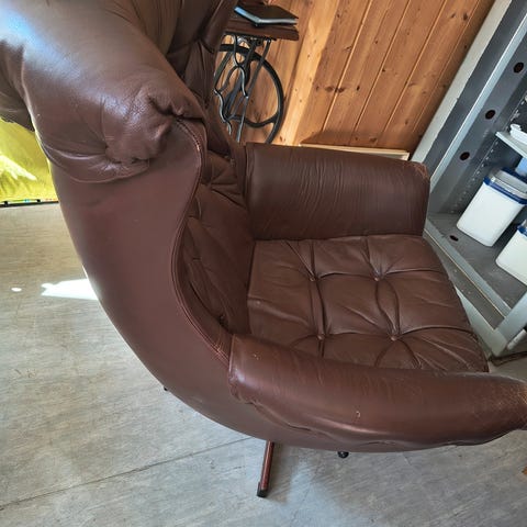 Godt brukt stol gis vekk. Slitasje på armlener (sjå bilde). Eine armlene er litt laust. Mangler underdelen av skrua. Mulig eg klarer å finne den igjen. Må hentast i Stardalen I Jølster. Kan evt fraktast til Førde etter avtale.