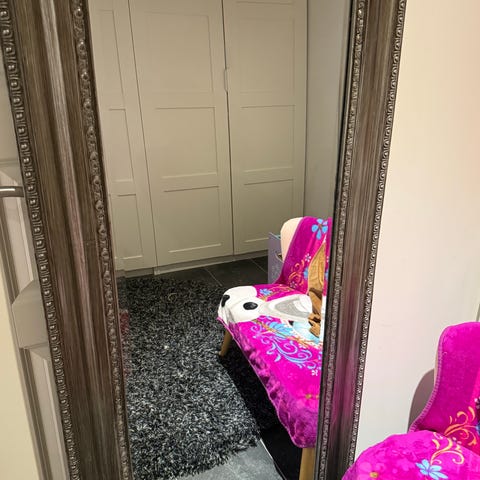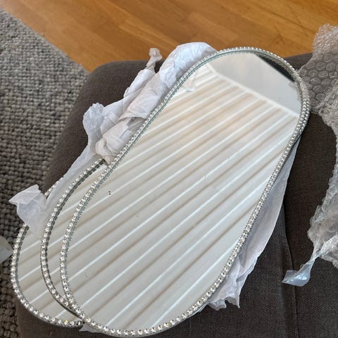 Har to små speil som ønsker seg nytt hjem. De er i mørkt tre, har en liten innvendig bord med håndmalte blomster og den innerste kanten mot speilet er i gull. Har tidligere vært brukt over vask.
