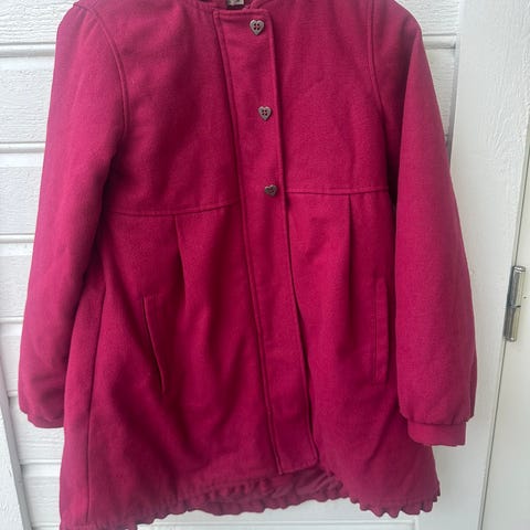 Nydelig rosa ullkåpe fra Name-it med kjempefine detaljer. Bord over brystet, hjerte på armen, hjerte bak på hetta som har en søt form. Dette har vært en favoritt som nå er for liten. Kåpen er av god kvalitet og er både god og varm. Innsiden er dekket med silkestoff. Den er brukt en del, men ser fremdeles fin ut og alt fungerer som det skal. Glidelåsen glir lett igjen, trykknappene funker godt. Det eneste er at innerlommen har løsnet litt, men den kan lett sys på igjen med noen få sting (se bilde).
