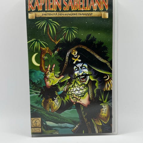 Kaptein Sabeltann Jakten på den magiske diamant VHS film. Norsk barnefilm basert på Kaptein Sabeltann-serien. Inneholder eventyr og skattejakt. VHS-kassett med originalcover og norsk tekst.