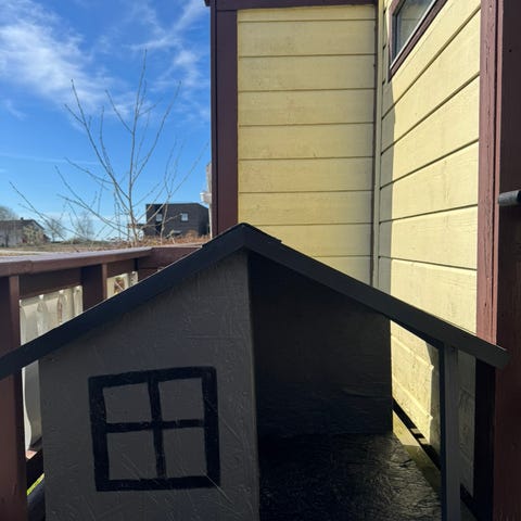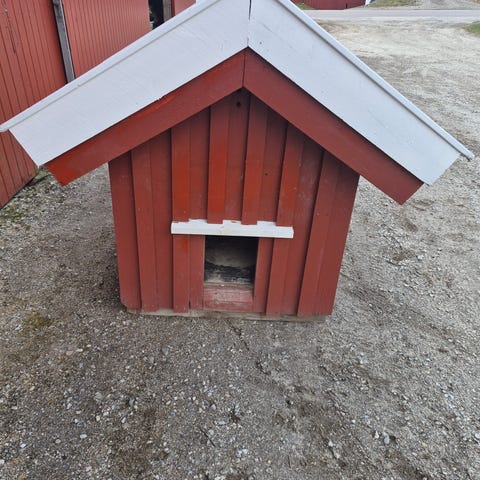 Nybygd hundehus på pall 80x120cm med svart takstein. Åpning er ikke laget av forskjellige årsaker, men kan lages etter ønske.