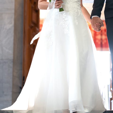 Ønsker at noen andre skal få mulighet til å bruke denne nydelige brudekjolen. Den har blitt brukt to ganger. Var i utgangspunktet litt for liten til meg og har derfor sydd den ut i ryggen hos sydame. Den kan reguleres i ryggen og vil derfor passe deg dersom du svinger mellom ulike størrelser. Sydamen har også ordnet slik at slepet kan knyttes opp og blir enklere å bevege seg i. Tenker den kan passe deg om du er størrelse 38/40 eller 40/42. Jeg er 174cm høy og hadde ca 4 cm hel.