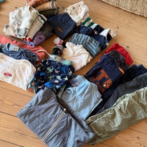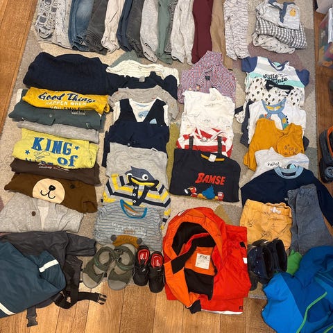 Newbie sælebukse, som ny, to ullbody, tre body, tre cardigans, to vår jakker, en regnjakke, en jeans, polotrøye, kortermet skjorte, sokker, ull lue. Noe brukt, noe som nytt.