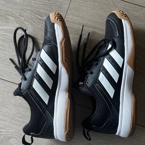 Adidas barnesko i størrelse 37 1/3, unisex. Skoene er svarte med hvite detaljer og har en gummisåle. Passer for barn og kan brukes til ulike aktiviteter. Nesten ikke brukt.