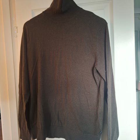 Hugo Boss genser i svart farge. Genseren har en høy hals og er laget av et mykt 100%Virgine Ull, det står størrelse xxl på den men føles liten I størrelse, Den passer best Large/Medium. Genseren er nesten ubrukt.