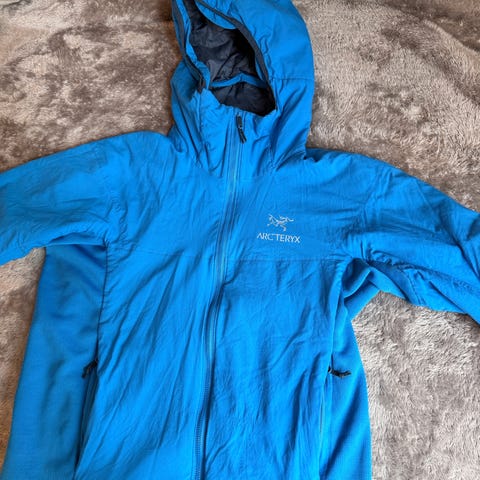 Arc'teryx Chain-Peril M's jakke i blå farge, størrelse M. Pent og lite brukt. Materialet er lett og egnet for utendørs bruk.