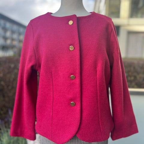 Draktjakken er dessverre litt liten for meg og prøvebyste. Nydelige detaljer og håndsydde knapphull. Se bilder. Ullboucle ytterstoff og silke inni. Det er litt misfarging inni i ermehull men jakke er renset. Evt kan jeg hjelpe med å erstatte innerstoff der det trenges. Det synes ikke på utside.