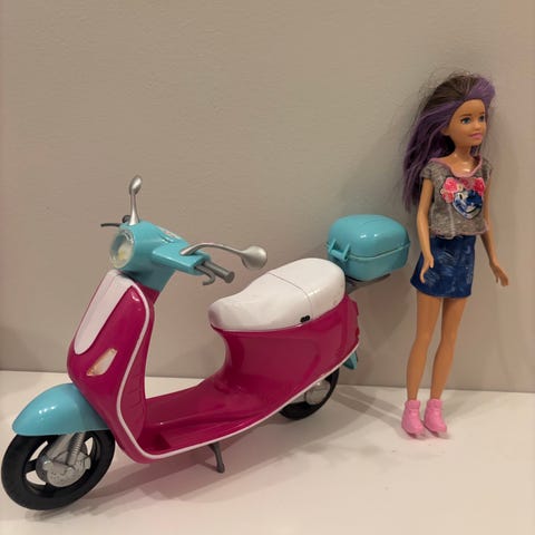Barbie Scooter leke i rosa og rød plastmateriale. Passer som leketøy for barn. Har detaljer som seter og håndtak. Designet for innendørs bruk.