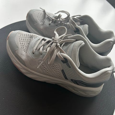 Joggesko i størrelse 36 med hvit farge og detaljer i oransje og lyseblått. Skoene har en solid såle med mønster for godt grep. Egnet for løping.