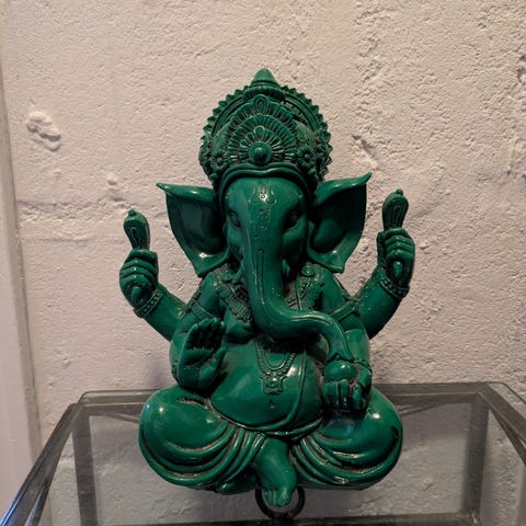 Ganesha statue laget av bronse. Figuren viser den indiske guden Ganesha sittende på en dekorert base. Ganesha blir tilbedt av hinduer som den som fjerner hindringer når noe skal påbegynnes, og han beskytter mot ulykke. Skulpturen har en mørk bronsefarge med detaljer i lysere nyanser. 9 cm høy og 6 cm bred. Kan nok pusses med bronsepuss for et mer skinnende utseende.