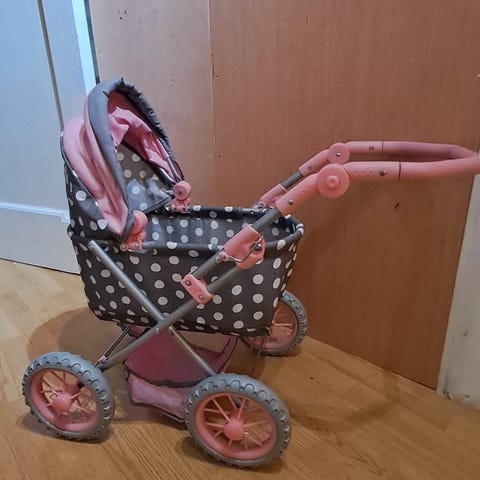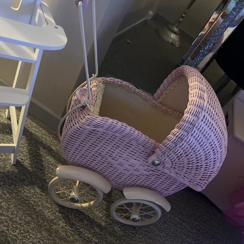 IKEA dukkevogn laget av rotting i rosa farge. Vognen har fire hjul og et håndtak for enkel skyving. Passer til lek med dukker og små barn, den er veldig lite Designet for innendørs bruk. DEN blir ikke brukt, selges som den er, må hentes.