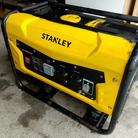 Loncin 2500DC bærbar strømaggregat med gul metallkonstruksjon og svart ramme. Utstyrt med drivstofftank på toppen og kontrollpanel med av/på-bryter, uttak og indikatorer. Egnet for midlertidig strømforsyning i ulike utendørs- og innendørs situasjoner. Helt ny, aldri vært i bruk.