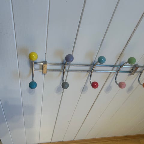IKEA barneknagg i tre med flere fargede kroker. Designet for barn og laget av naturlige materialer. Passer til oppbevaring av klær eller småting på barnerommet.