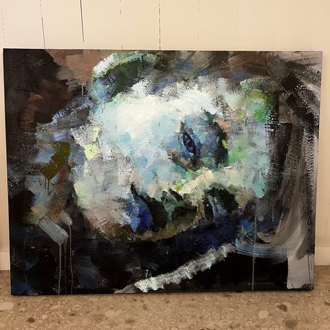 Fargerikt abstrakt maleri med ulike figurer og mønstre i sterke farger som rosa, blått, grønt og gult. Maleriet har en leken og livlig stil med varierte former og fargekombinasjoner.