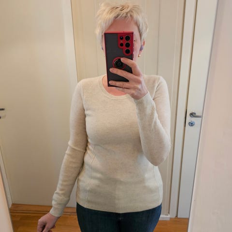 H&M genser / topp med korte ermer, str S (normal), cream farge. 100 % kashmir, kasjmir. Lite brukt, i veldig fin stand. Selges til 400 kroner.