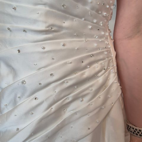 Skoa er i 41-42 og brudekjolen og underskjørtet er i XL og har blitt brukt engang og selger skoene og brudekjole og underskjørtet i ett. Skon har fått en liten skrape på Hælene. For mere info så kan du sende melding. Brudekjolen heter LILY XL.
