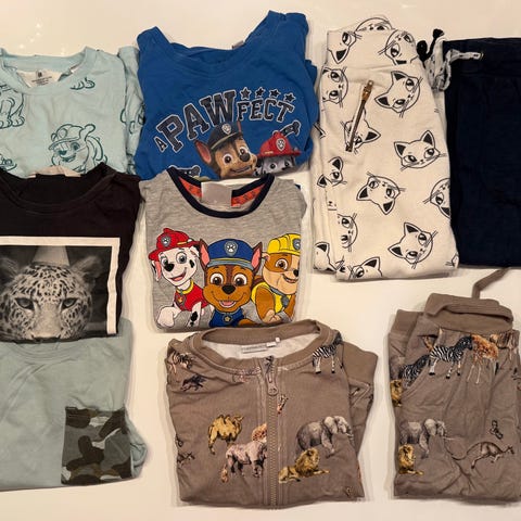 Paw patrol hettegenser størrelse 4 år (litt liten i størrelse), Hummel bukse 98, H&M minni mus jakke 98-104, tunika 98-104, Minni mus tunika i tynn bomull 98-104, lys lilla thights fra polarn og pyret i str 98, lite hull på kneet, og noe løvetannflekker fra barnehagelivet. Fine klær med masse bruk igjen! Ikke røyk eller dyr i hjemmet