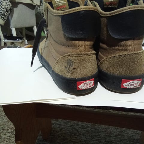 Converse Sneakers 'Five Finger Death Punch' joggesko i størrelse 44. Skoene er svarte med røde og hvite mønsterdetaljer. Materialet av tekstil. Gummi såle. Designet er høyt på ankelen med hvite/røde lisser. For samlere eller til hverdagsbruk. Ekte merch.fra Bravado Germany