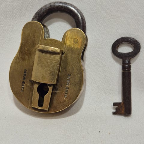 Dette er en solid og stilig lås i kraftig metall, perfekt for samlere av gamle låser, antikviteter eller industrihistorie.