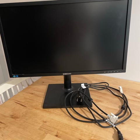 Dell og AOC skjermer uten stativ. Passer til bruk i kontor- og hjemmeinnstillinger. Kabler følger med