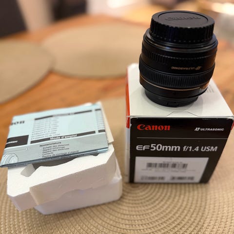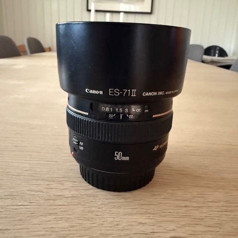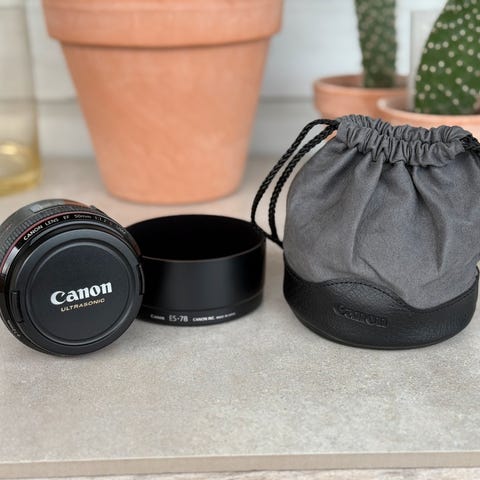 Canon EF 50mm f/1.2L USM objektiv med stor blenderåpning på f/1.2. Objektivet har en brennvidde på 50 mm og er laget for Canon EF-fatning. Det er konstruert med høy kvalitet optikk og er egnet for portrett- og lavlys fotografering.