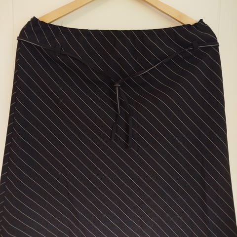 Skjørt med normalhøy midje. Midjen er laget i elastisk strikk, med en omkrets på 77cm. Lengden i siden er 47cm. Skjørtet er buet, med mønster som går i ulike farger, flest grønnfarger. Merket er Street One, og størrelsen er 38.
