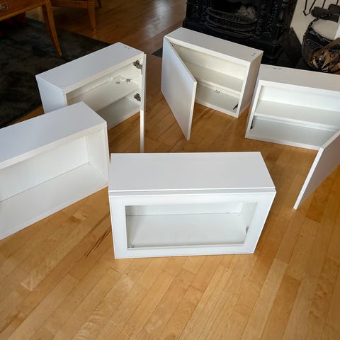 Vegghengt skapkombinasjon selges. Dette er individuelle skap man kan flytte rundt som man ønsker.