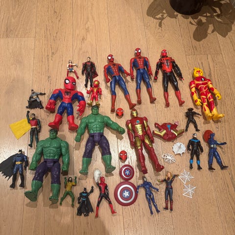 Guttene selger samlingen sin med superhelter. Superheltene er lekt med, men guttene er blitt leie, men superheltene er klar for mye lek ennå. De er store ca 30 cm.