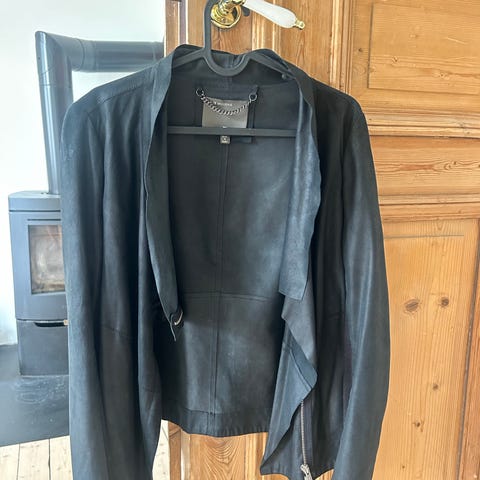 Bikerjakke i skinn . Ikke brukt da den er litt liten i str . Vil si den er 40/42
