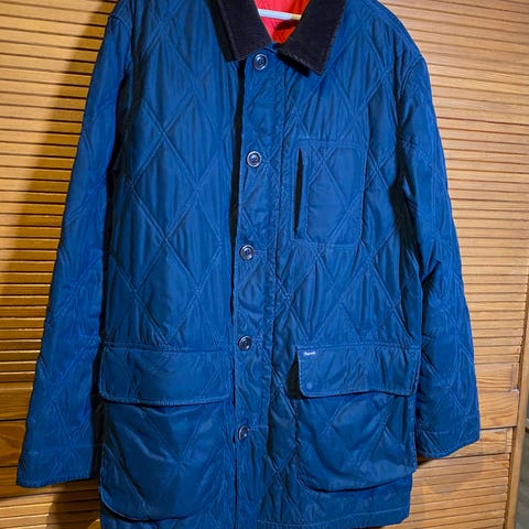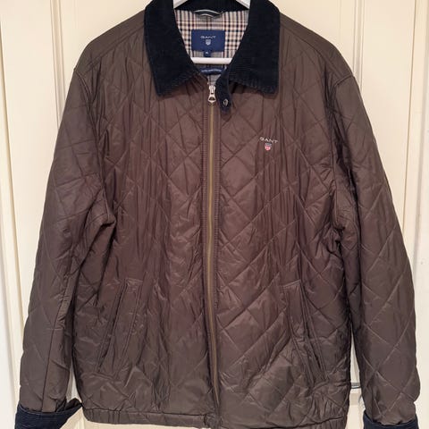 THE UPSTATE QUILTER. Elegant marineblå fôret jakke fra Gant. Størrelse 3XL, regular fit passform. Måler 87cm fra kragen og ned målt bak, skuldersøm til skuldersøm 56cm, skuldersøm til håndledd 72cm, midjemål målt flatt 67cm. Lukking med kraftig to-veis glidelås og knapper, haugevis med utvendige lommer med trykknapper, innerlomme med glidelås, stramming ved håndledd. Et par løse sømmer, ellers nyvasket og fremstår i fin stand med normal brukspatina, se bilder for tilstand. kl3