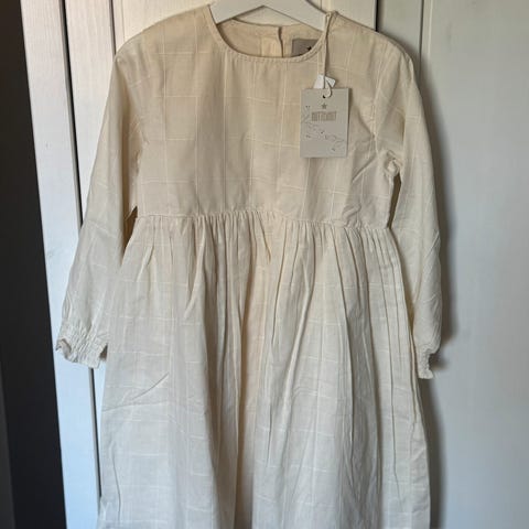 Selger en nydelig linkjole, størrelse 2-3 år. Kjolen har elegant snitt, A-fasong, pen krage og 3/4 ermer. Den er lysblå/mintgrønn. Fra det spanske merket Motoreta som lager eksklusive barneklær. 100 % lin. En klassisk kjole som passer til penere anledninger som jul, barnedåp eller bursdager. Sender gjerne!