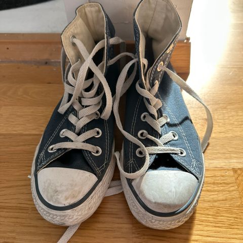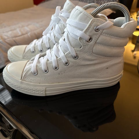 Converse Unisex barnesko i størrelse 35, laget av svart lær. Skoene har høyt skaft med snøring og er foret med mykt materiale for ekstra komfort. Passer for både gutter og jenter.