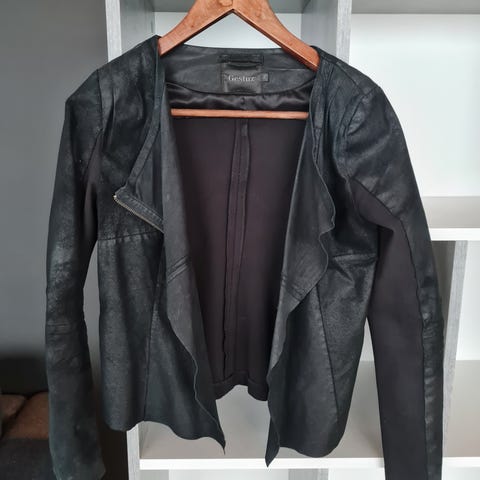 Nesten ubrukt jakke i geiteskinn selges. Trykknapp-knepping, og to lommer med glidelås foran. Fôret.