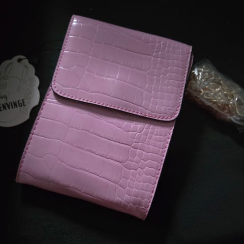 Den er laget i imitert croco skinn-kvalitet og fôret med et lekkert stoff.