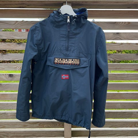 Napapijri unisexjakke, blå, str. 152/12, med innbrettbar hette, mellomtykk jakke, pent brukt, mye bruk igjen.