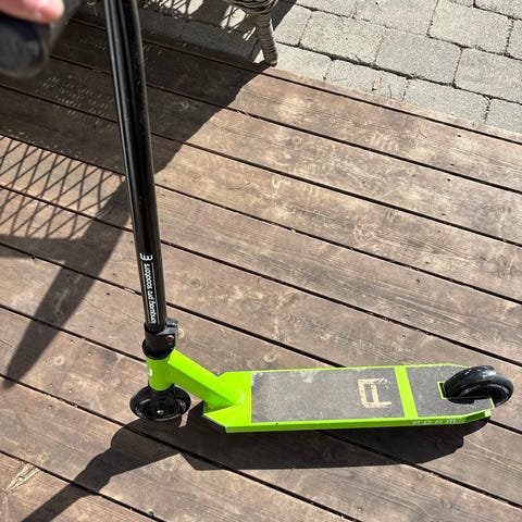 Hudora Spark elektrisk sparkesykkel med grønt brett og svart styre. Sparkesykkelen har tre hjul og kabelstyring. Egnet for barn eller unge som ønsker et elektrisk fremkomstmiddel for korte avstander. Selges uten lader