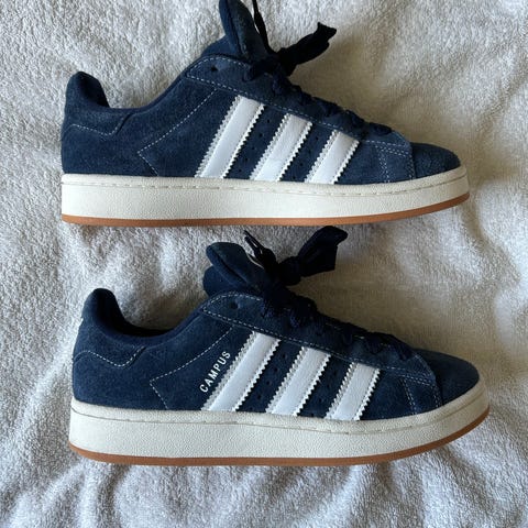 Adidas Campus sneakers i størrelse 42,5. Skoene er laget i blått semsket skinn med hvite detaljer og såle. Brukt 2 ganger . Fremstår som meget pene.