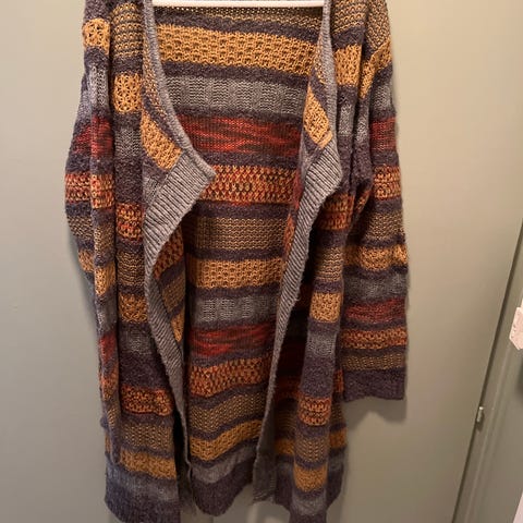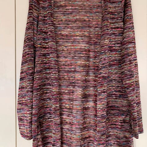 Flott lang ullcardigan / fargerik strikkejakke / "chunky knit" cardigan. Løst strikket cardigan med dype lommer. Fra Haust Collection. I stilig "boblegarn", 100% merinoull. Duse regnbuefarger. Står str 38, men er mer en L-XL. Skal være oversized. Mål på forespørsel.