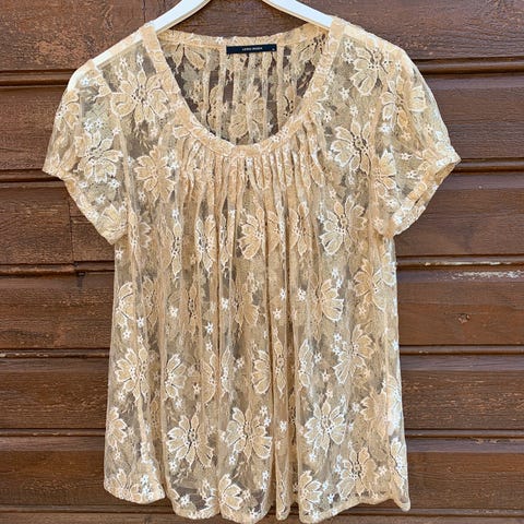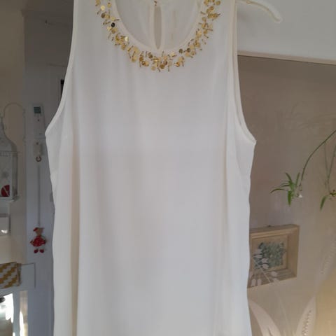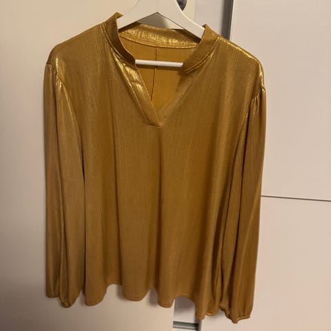 Victoria topp i gull med paljetter og gullperler. Str. XL, men passer M-XL da den har god stretch.