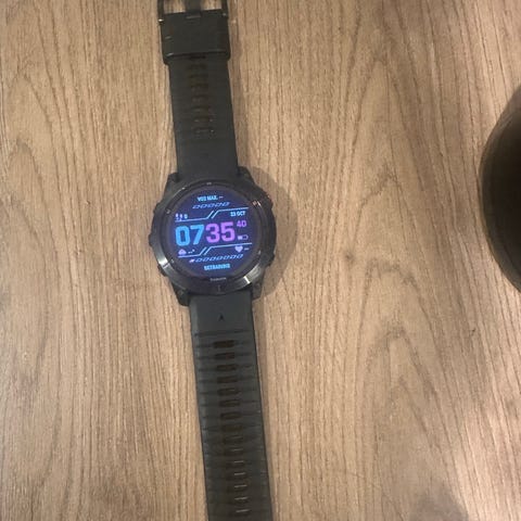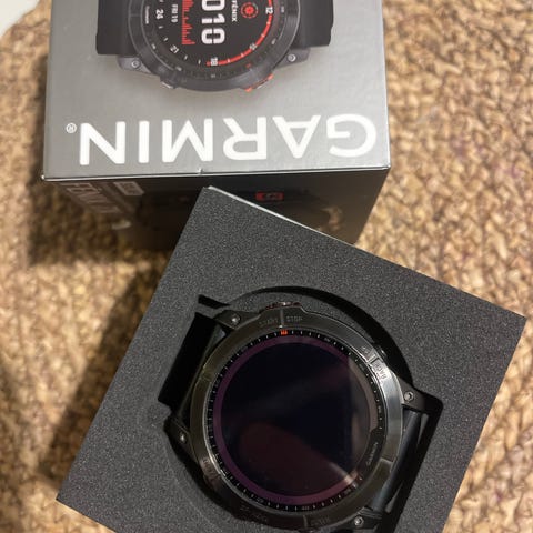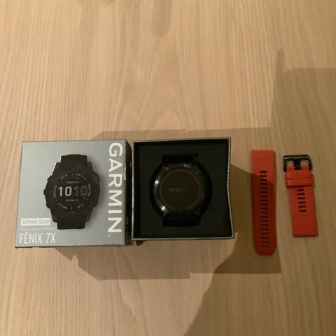 Garmin Fenix 7X Sapphire Solar smartklokke med svart urkasse av titan. Flott klokke, og det følger med to ekstra reimer kjøpt fra Garmin. Små bruksmerker på urkassen, se bilder. Reimer vasket med sitronsåpe. Ladekabel og kopi av papirkvittering (se bilder) vedlegges.