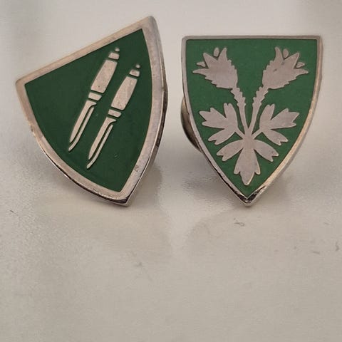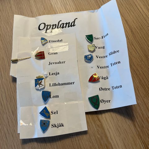 2 pins med Nord-Odal kommunes kommunevåpen selges. Kr 50 pr stk .