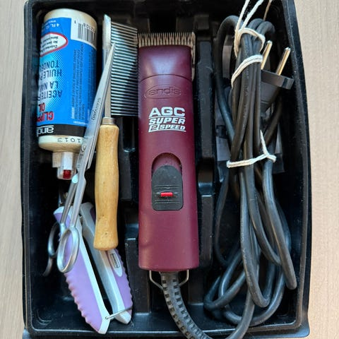 Hundeklipper i god stand med skjær ekstra skjær har en skade som ses på bilde, men har klippet me d fordi om og 2 flaske olje selges.