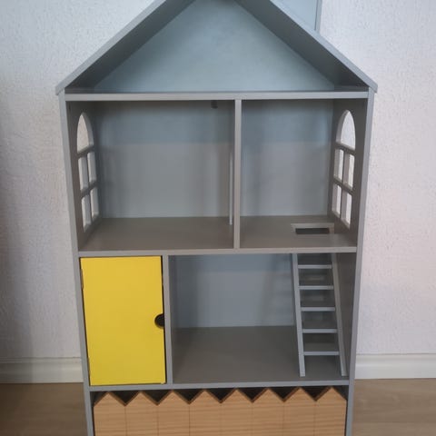 Dukkehus med noen møbler. Alt i plast.